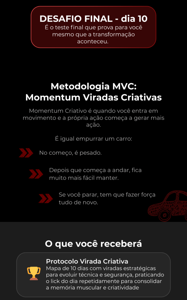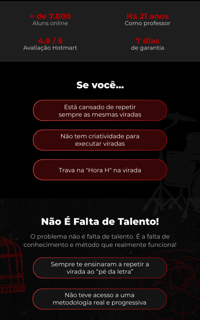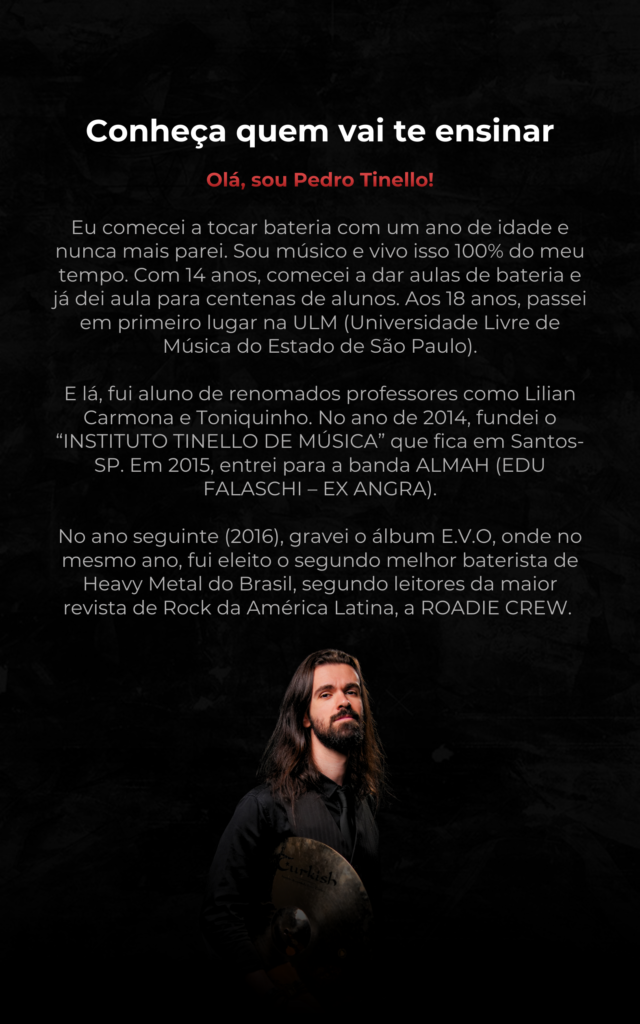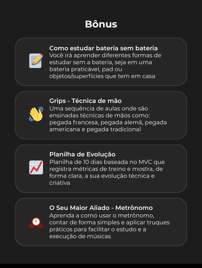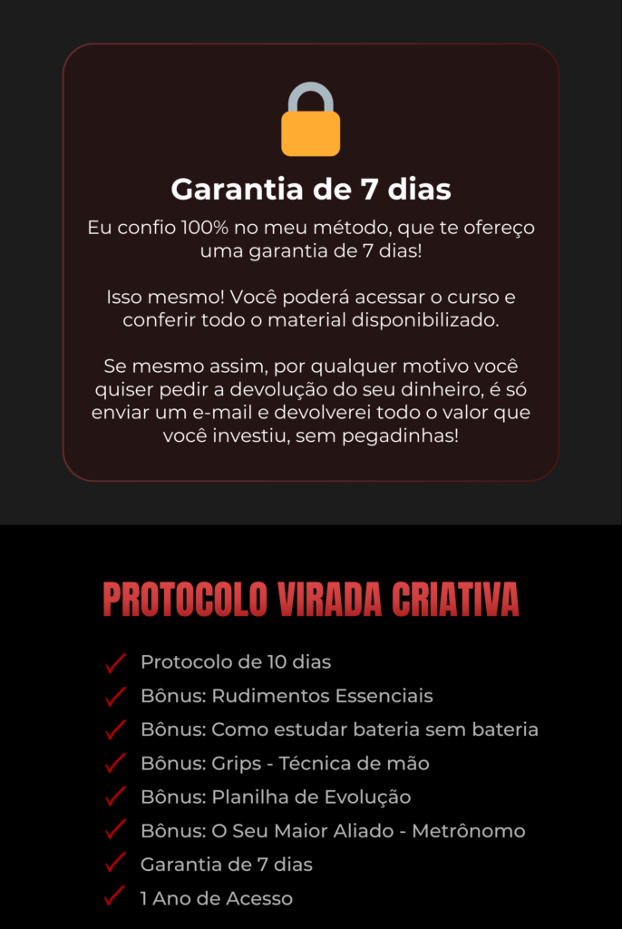 Ao final dos 10 dias, o baterista sai do estado de bloqueio criativo e previsibilidade para tocar com confiança, controle e musicalidade. Ele não apenas aprende 10 viradas, mas entende a lógica por trás delas, desenvolvendo técnica, memória muscular e segurança rítmica. Com isso, passa a criar variações próprias, aplicar as ideias em músicas reais e enxergar uma evolução concreta em precisão, velocidade e consistência. O resultado é deixar de soar amador para tocar com intenção e identidade.